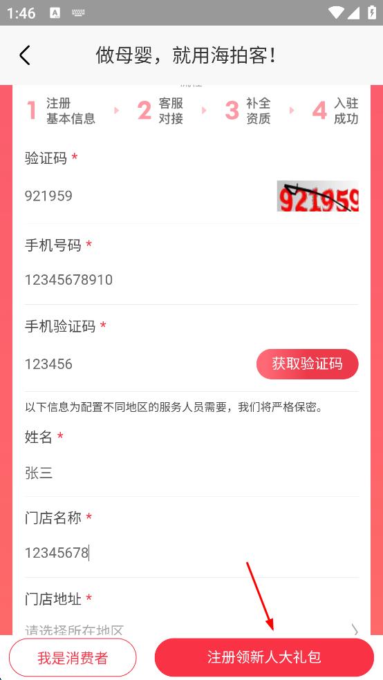 4、填寫完所有信息后,點擊“注冊領(lǐng)新人大禮包”按鈕,完成申請入駐操作。