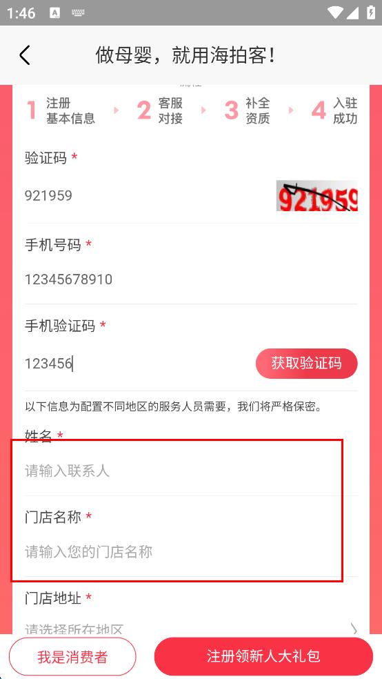 3、繼續(xù)在頁面中填寫“姓名”和“門店名稱”等信息。