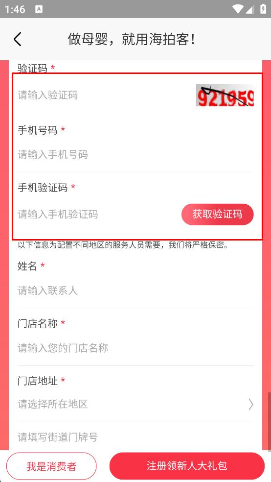 2、在入駐信息填寫頁面,依次在“驗證碼”“手機號碼”“手機驗證碼”輸入框中,填寫好對應(yīng)信息。