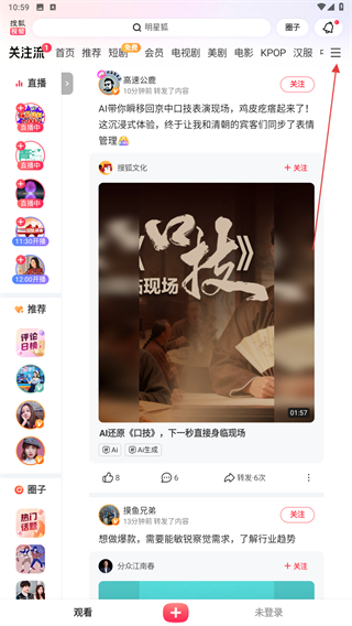 1、打開(kāi)搜狐視頻的APP,進(jìn)入時(shí)點(diǎn)擊右上三個(gè)橫線的圖標(biāo)。