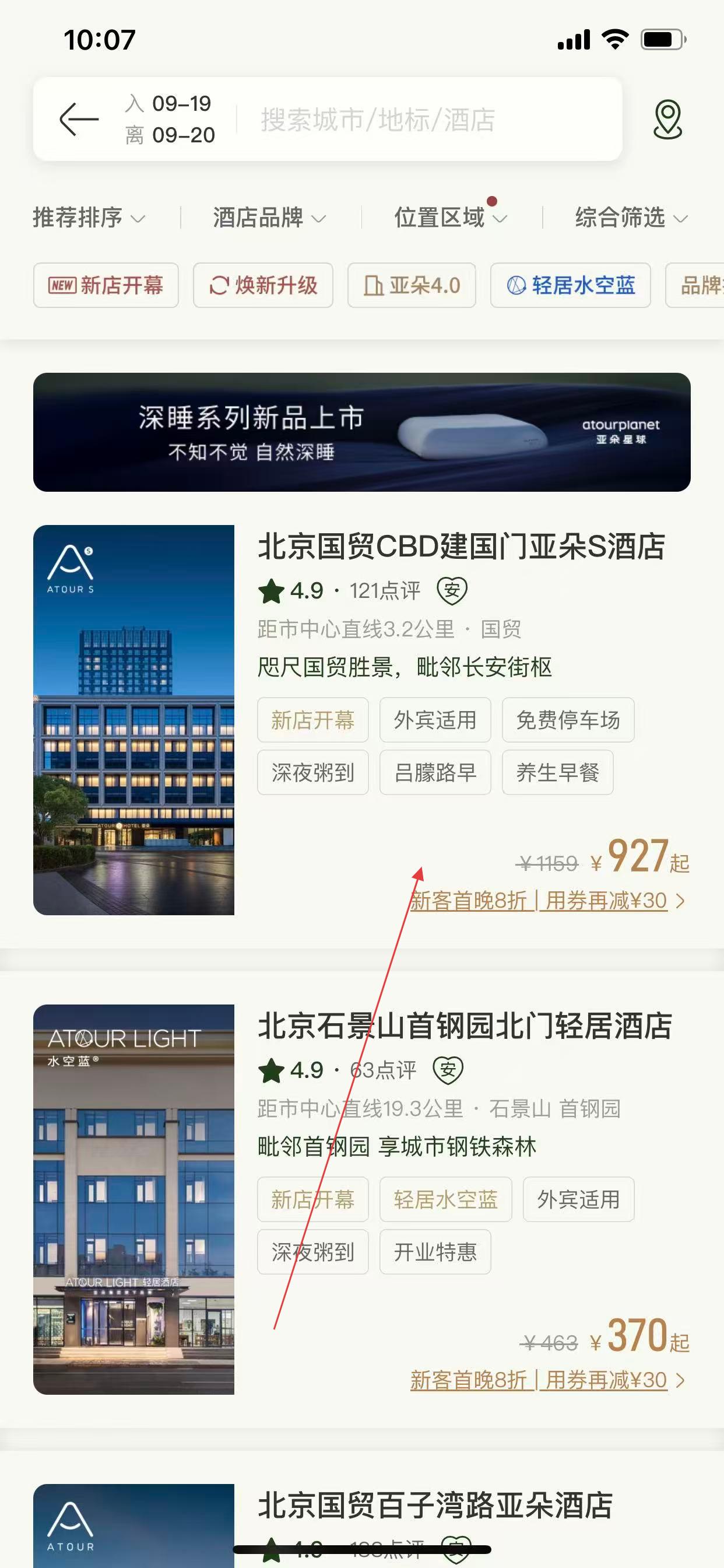 3、按位置和時(shí)間需求,篩選符合條件的亞朵酒店。