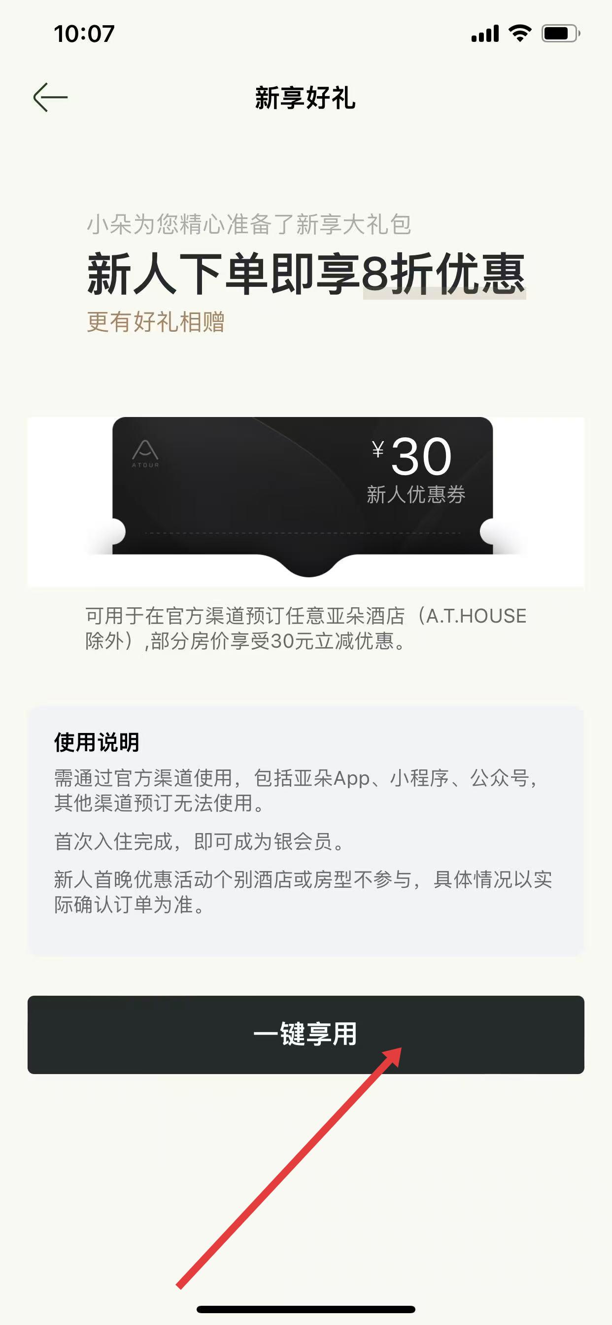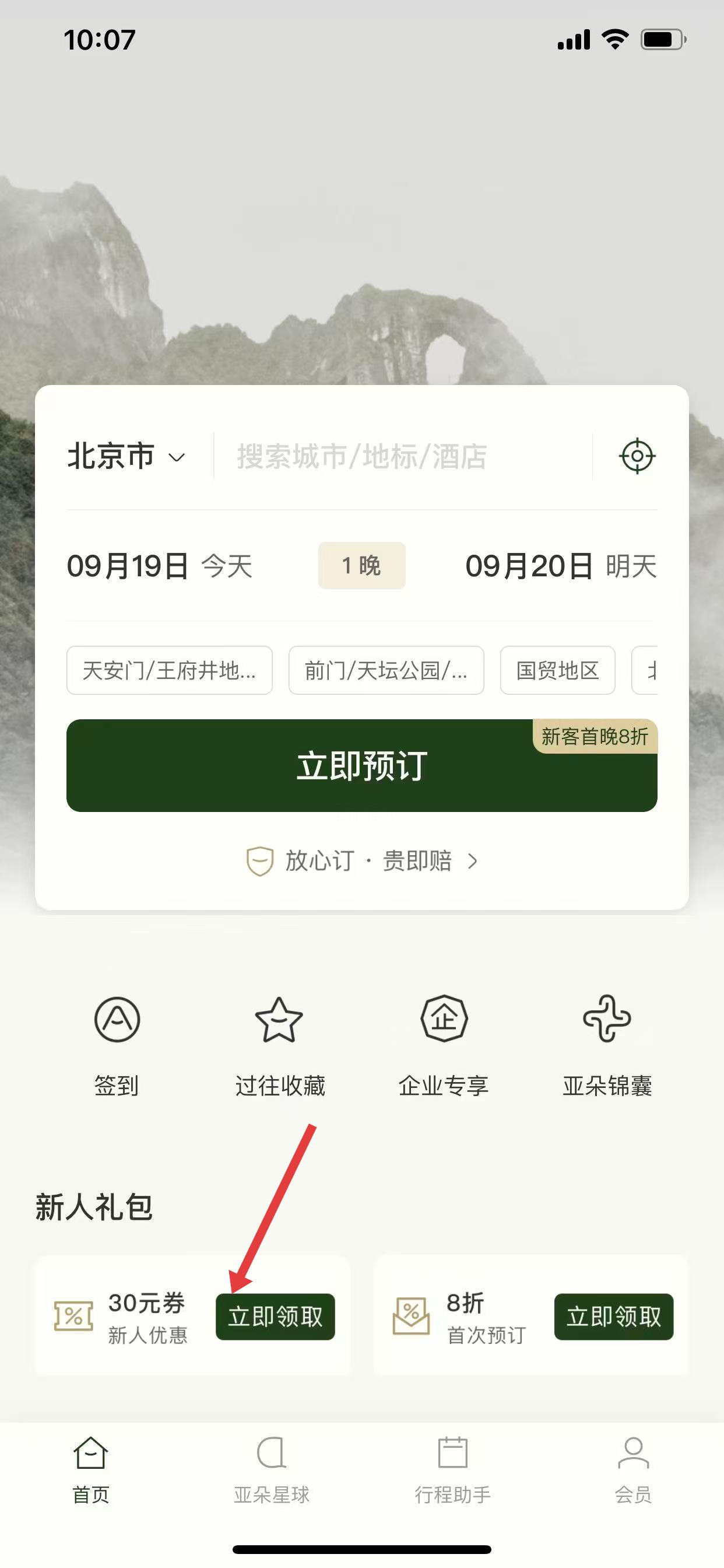 1、打開(kāi)亞朵APP,在首頁(yè)新人禮包板塊領(lǐng)新人優(yōu)惠券。