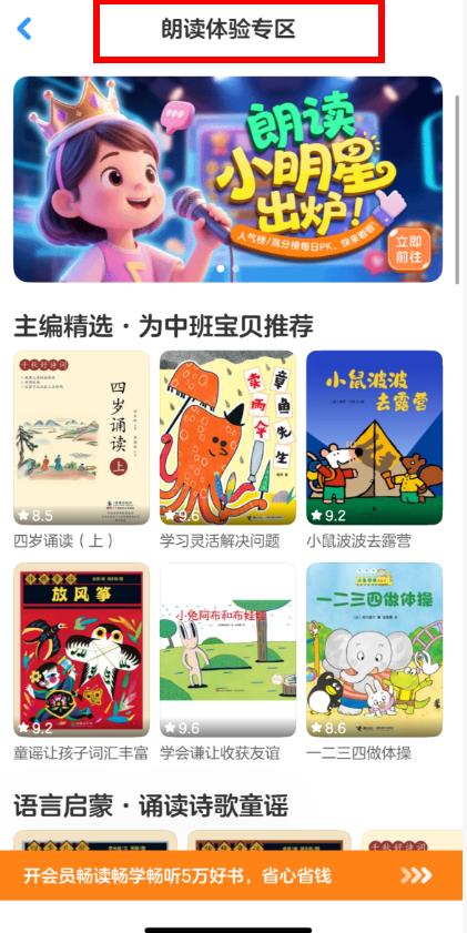 3、進(jìn)入朗讀體驗(yàn)專區(qū)頁面,即可選擇相應(yīng)的繪本,開啟朗讀體驗(yàn)。