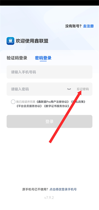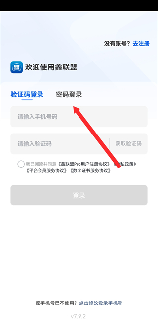 1、打開鑫聯(lián)盟APP,在登錄頁面點擊密碼登錄的按鈕。