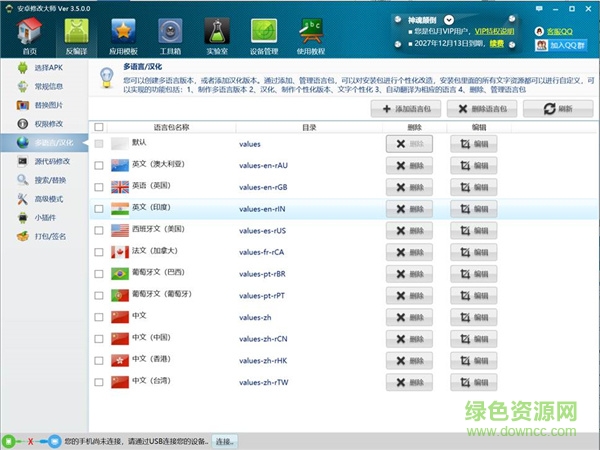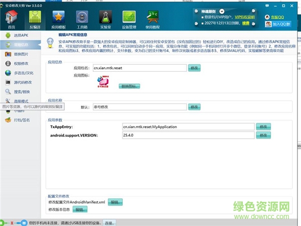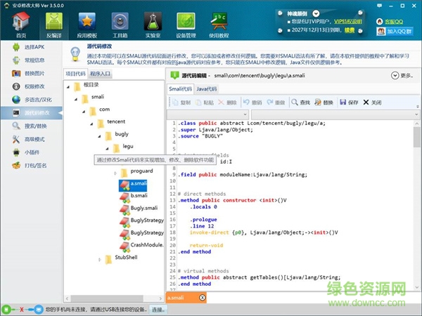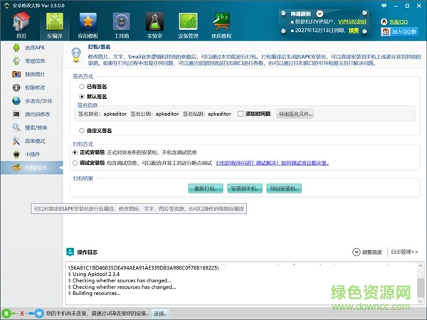 自由定制任何沒有加固過的APK安裝包,可以修改應用程序圖標和應用程序名稱、替換界面嗎上面的任何文字和圖片、翻譯或者漢化制作多語言版本,更支持通過高級的SMALI代碼,實現(xiàn)對應用軟件的。