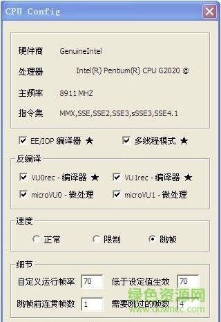 這個是CPU配置,CPU是3或4核心的可以把跳幀變成限制,CPU是雙核的必須跳幀,否則速度極慢,CPU是1核心的基本玩不起,自定義運行幀率,低于設定值生效果那個,兩個,不要高于75,否則的話速度會很快,難以控制。