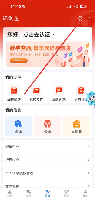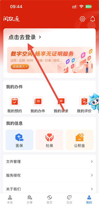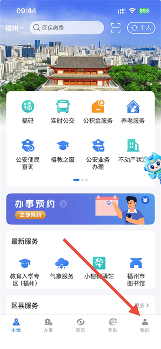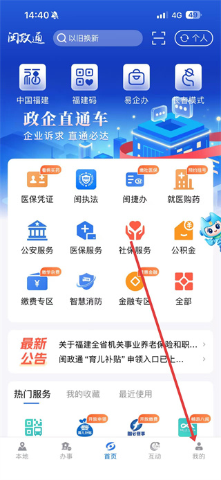 1、在閩政通app首頁(yè),點(diǎn)擊右下角我的按鈕,進(jìn)入個(gè)人頁(yè)面。