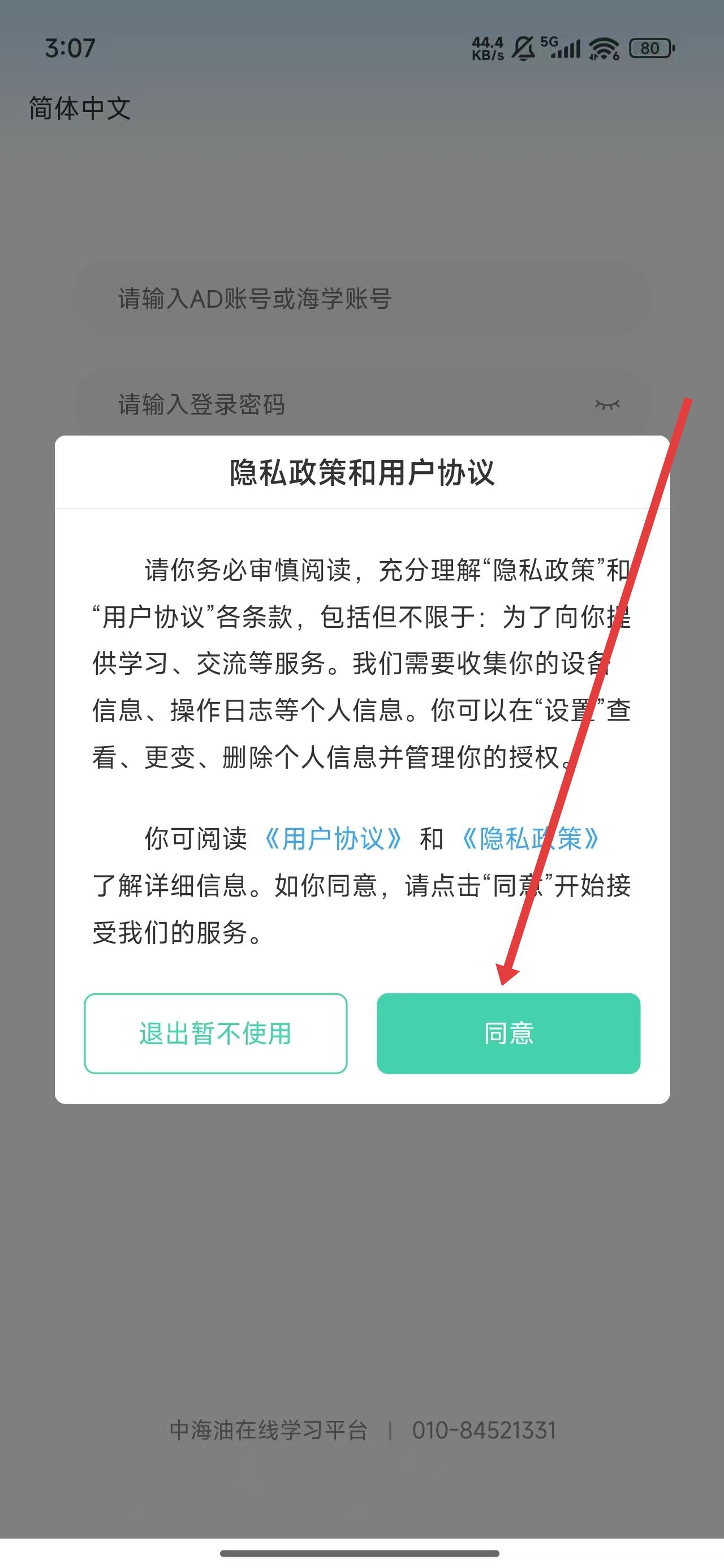 1、打開中國海油海學(xué)app后,點(diǎn)擊彈窗中的同意按鈕,進(jìn)入使用。
