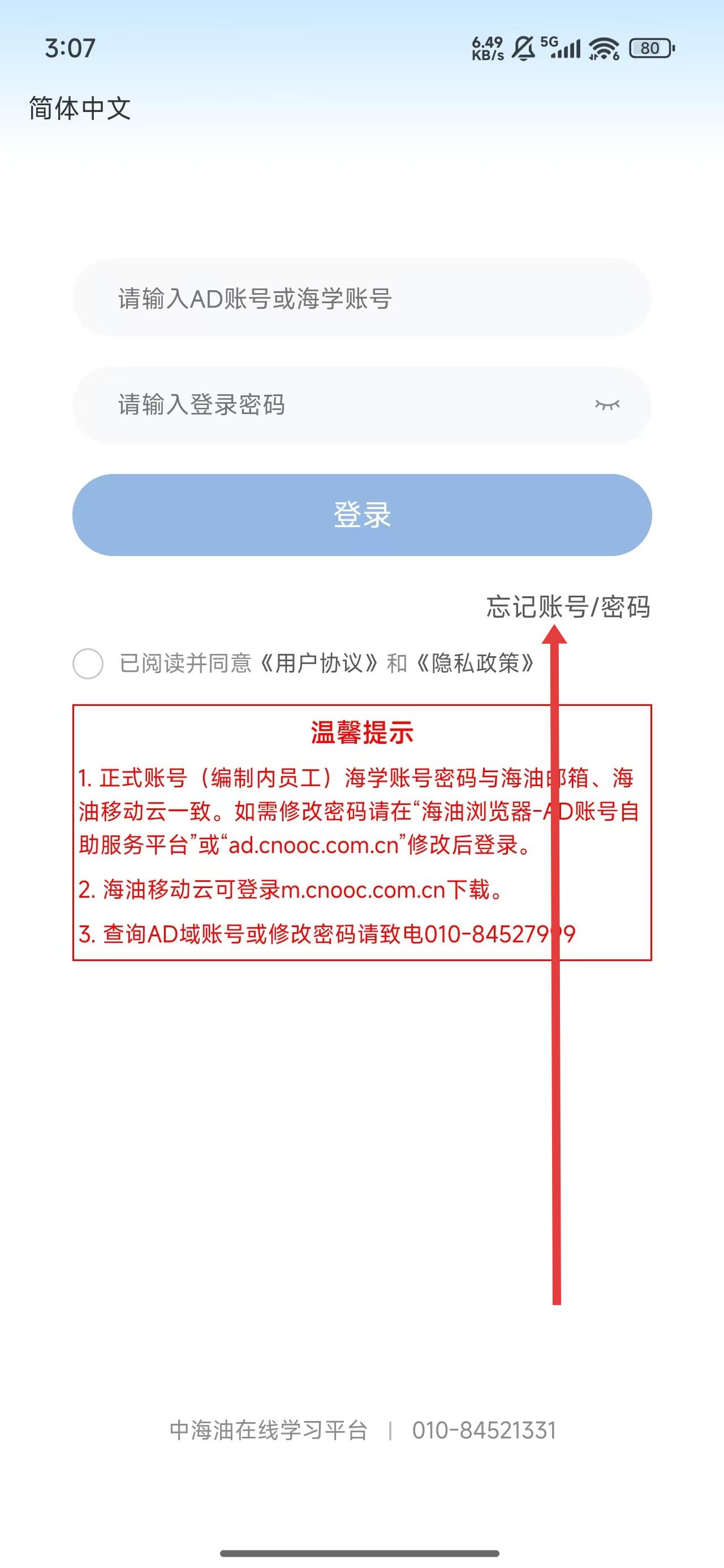 2、在進(jìn)入到登錄頁面中,若忘記了密碼,可以點(diǎn)擊下方忘記賬號(hào)/密碼按鈕解決。