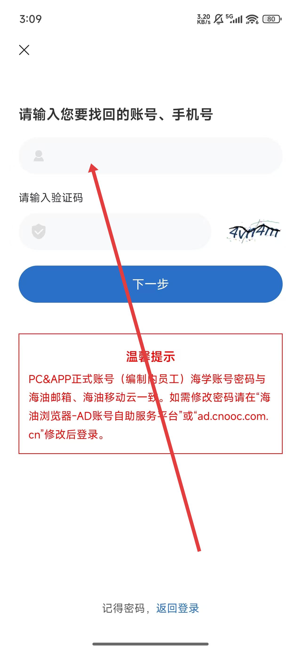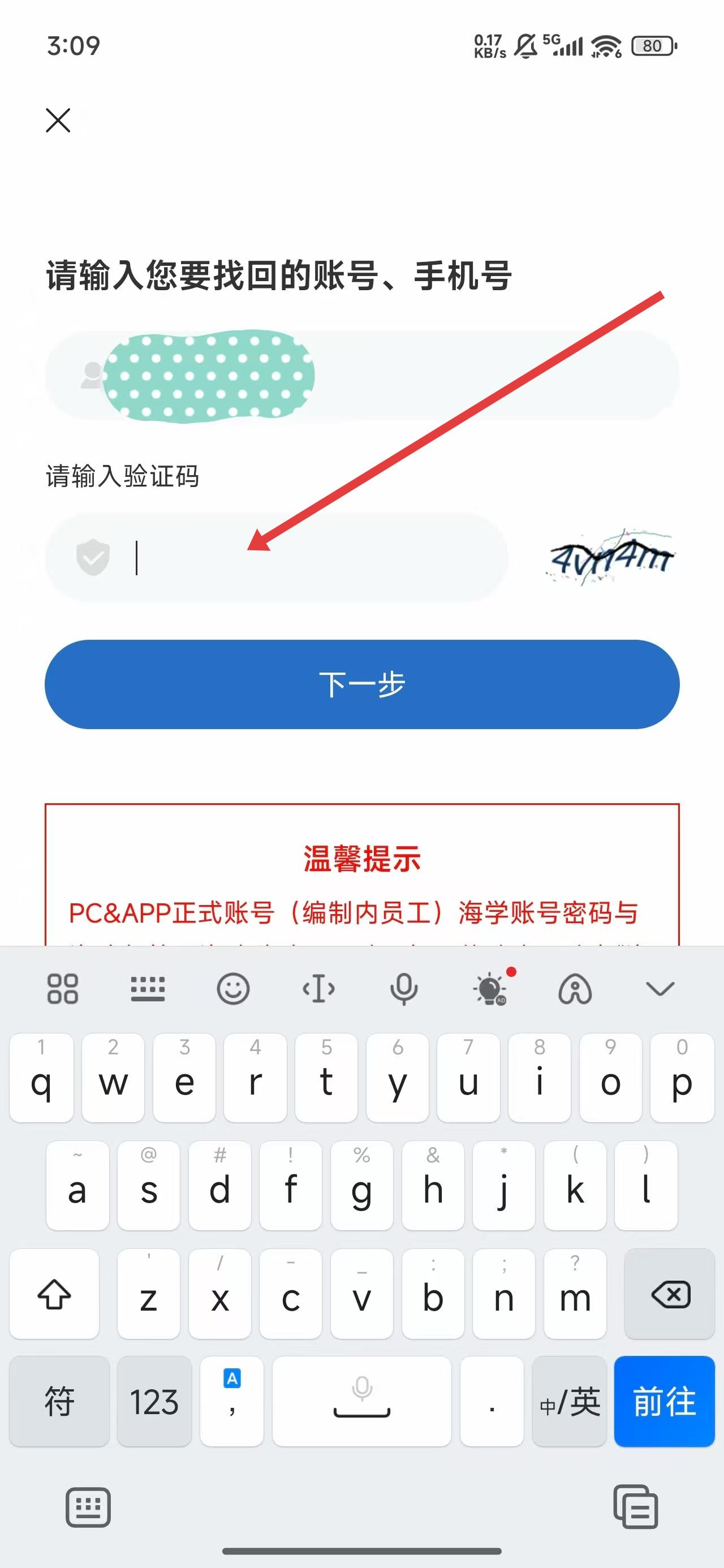 4、在填寫完賬號(hào)后,點(diǎn)擊下方輸入框填寫右側(cè)圖片中的驗(yàn)證碼后,進(jìn)行找回操作。