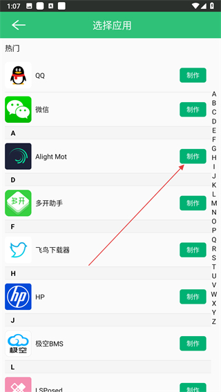 4、進入選擇應用界面,找到想要制作分身的應用,點擊其右側的制作按鈕即可。