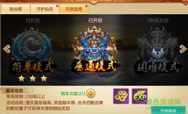 天帝寶庫是游戲中提供金幣來源的單人副本玩法,有三種難度,難度越高,獎(jiǎng)勵(lì)金幣越多。