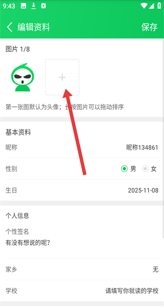 4、在編輯資料頁面點(diǎn)擊+號(hào)按鈕,即可進(jìn)行添加圖片修改頭像。