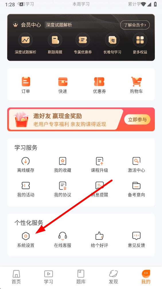 2、在我的界面中,向下滑動找到個(gè)性化服務(wù)板塊,點(diǎn)擊系統(tǒng)設(shè)置。