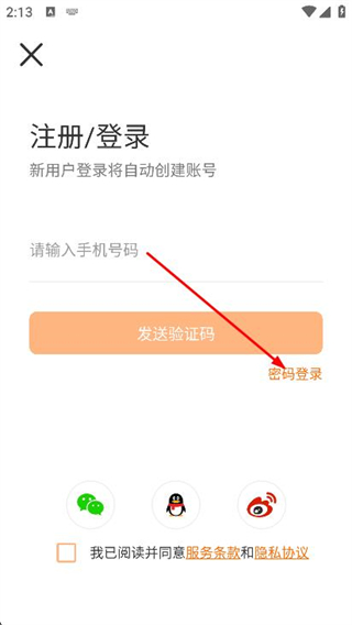 3、在注冊/登錄頁面,點(diǎn)擊下方密碼登錄選項(xiàng)。
