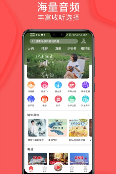 十八種分類:音樂(lè)、故事、明星娛樂(lè)、英語(yǔ)、相聲曲藝、軍事歷史、財(cái)經(jīng)、體育、生活、健康一統(tǒng)音頻,總有一款你最愛(ài)!