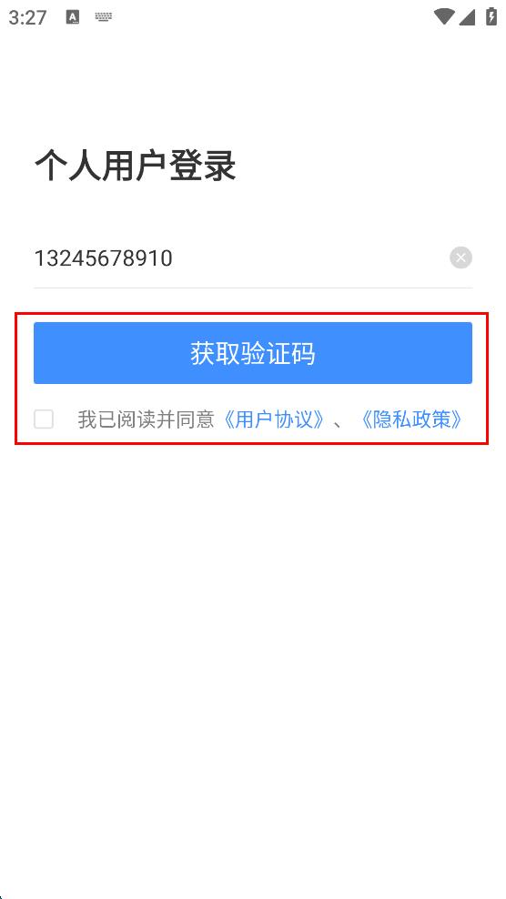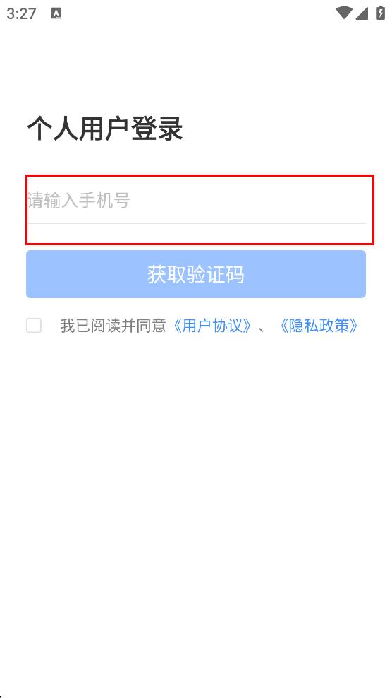 2、進(jìn)入個人用戶登錄頁面,輸入手機(jī)號,勾選我已閱讀并同意用戶協(xié)議,隱私政策。