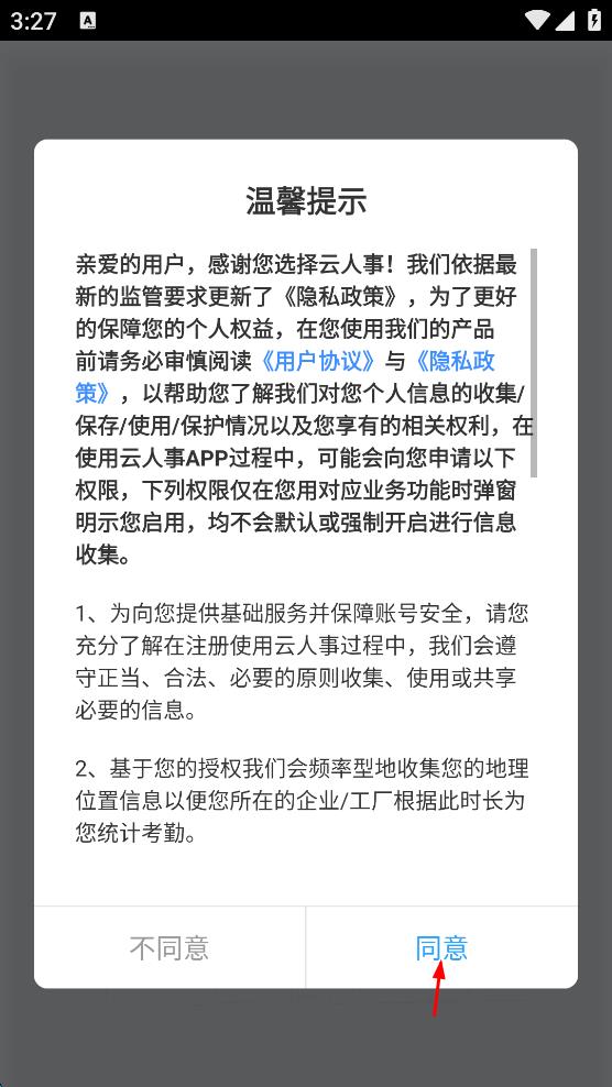 1、打開云人事App,在溫馨提示的頁面,點(diǎn)擊同意的按鈕。