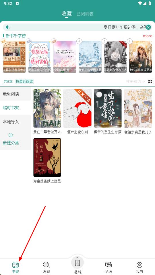 1、點(diǎn)擊界面底部書(shū)架圖標(biāo),進(jìn)入收藏列表界面,在最近閱讀區(qū)域定位《要在古早番做萬(wàn)人迷嗎?》,點(diǎn)擊書(shū)籍封面跳轉(zhuǎn)至詳情頁(yè)。