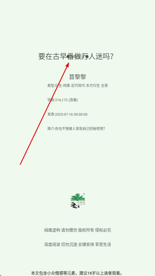2、在詳情頁(yè),查看作者苜黎黎、作品類型衍生·純愛(ài)·近代現(xiàn)代·東方衍生·主受、同時(shí)留意頁(yè)面底部純屬虛構(gòu)請(qǐng)勿模仿”等版權(quán)聲明與閱讀提示。