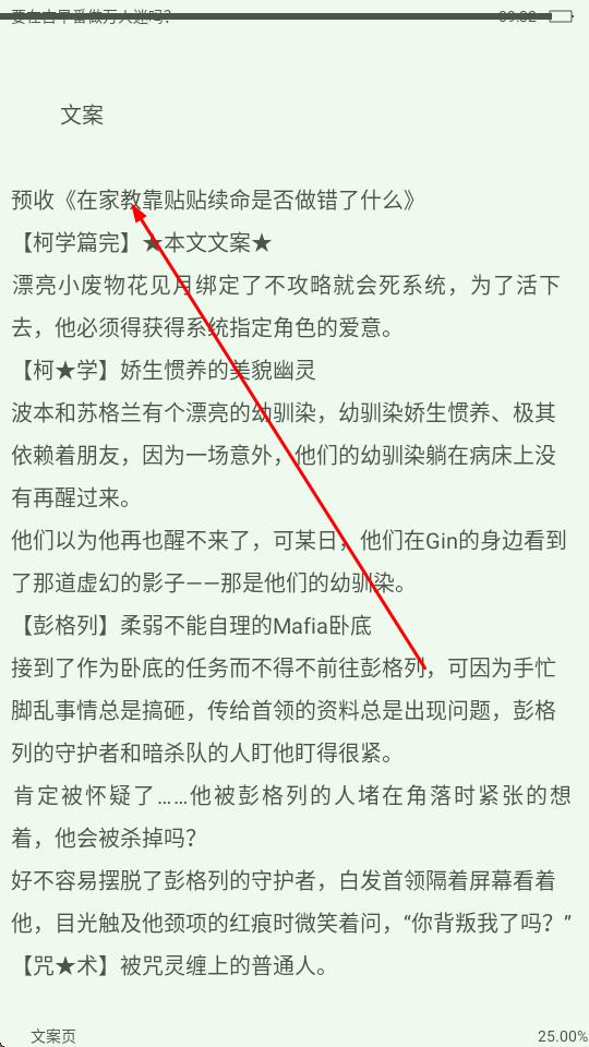 3、進(jìn)入文案頁(yè)瀏覽預(yù)收作品《在家教靠貼貼續(xù)命是否做錯(cuò)了什么》,以及正文篇章設(shè)定,【咒術(shù)篇】呈現(xiàn)被咒靈纏上的普通人遭遇,深入了解多線劇情脈絡(luò)。