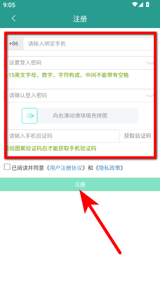 4、按要求填寫(xiě)手機(jī)、密碼等信息后點(diǎn)擊注冊(cè),即可完成賬號(hào)注冊(cè)操作。