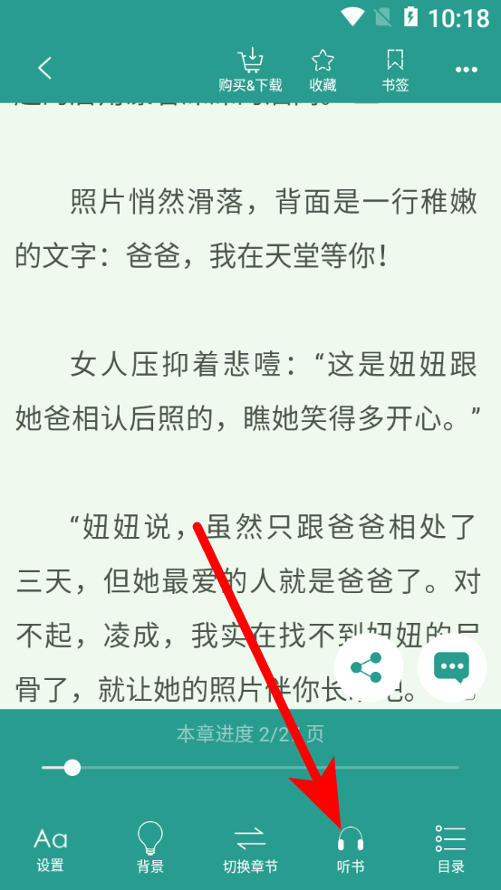 3、在小說(shuō)閱讀頁(yè)面,點(diǎn)擊下方聽(tīng)書(shū)選項(xiàng),進(jìn)入聽(tīng)書(shū)設(shè)置界面。