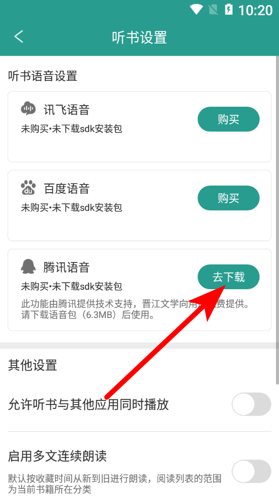 4、選擇語(yǔ)音包后點(diǎn)擊去下載,下載完成后即可使用聽(tīng)書(shū)功能,完成晉江小說(shuō)閱讀聽(tīng)書(shū)操作。