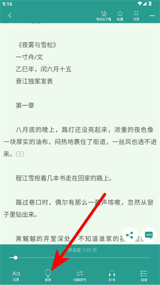 3、在小說(shuō)閱讀頁(yè)面,點(diǎn)擊下方背景選項(xiàng),展開(kāi)背景設(shè)置菜單。