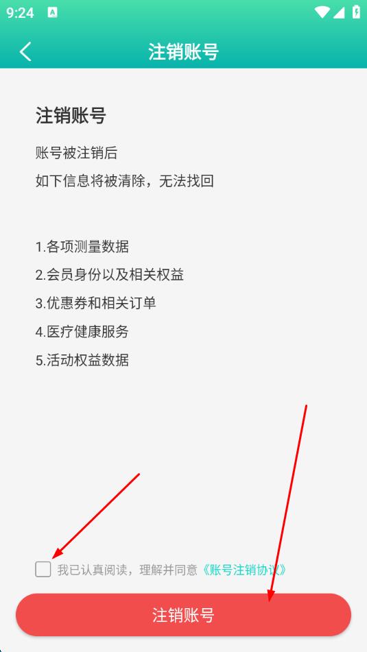 4、在注銷(xiāo)賬號(hào)頁(yè)面,勾選復(fù)選框,點(diǎn)擊注銷(xiāo)賬號(hào)按鈕。