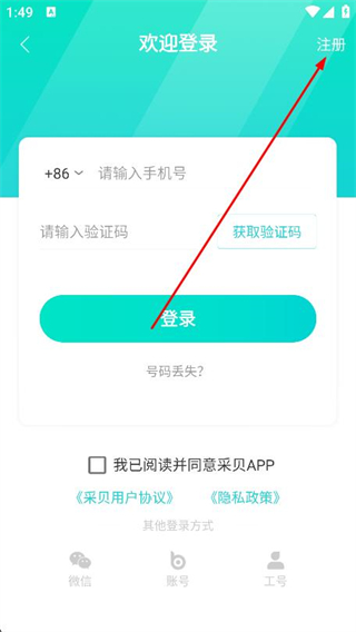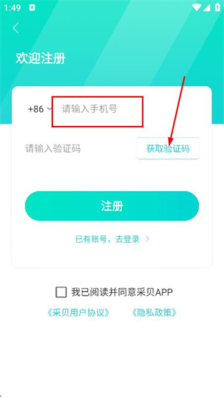 3、進(jìn)入注冊(cè)頁(yè)面后,輸入手機(jī)號(hào)碼并獲取驗(yàn)證碼。