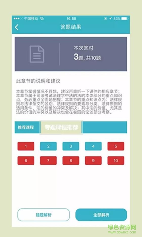 3、預(yù)測(cè)分?jǐn)?shù),后面會(huì)針對(duì)你在系統(tǒng)做題的正確率,和每個(gè)題(每個(gè)考點(diǎn))在司考中的考查頻率等來(lái)預(yù)測(cè)你的成績(jī),方便你掌握自己情況(數(shù)據(jù)已經(jīng)在記錄,但計(jì)算成績(jī)和顯示結(jié)果需要下一個(gè)版本)快來(lái)綠色資源網(wǎng)下載吧。
