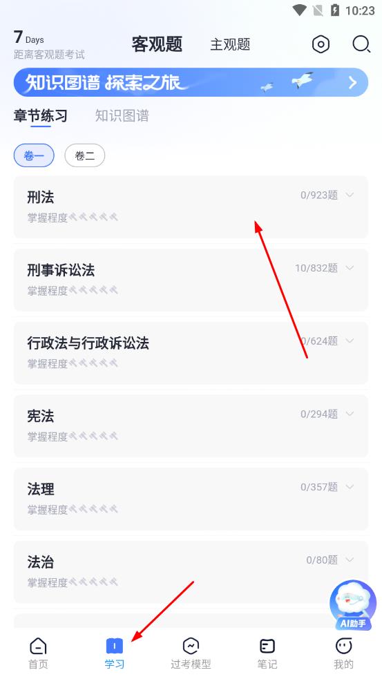 1、打開(kāi)覺(jué)曉法考App,進(jìn)入學(xué)習(xí)選項(xiàng),選擇想要練習(xí)的科目和試卷。