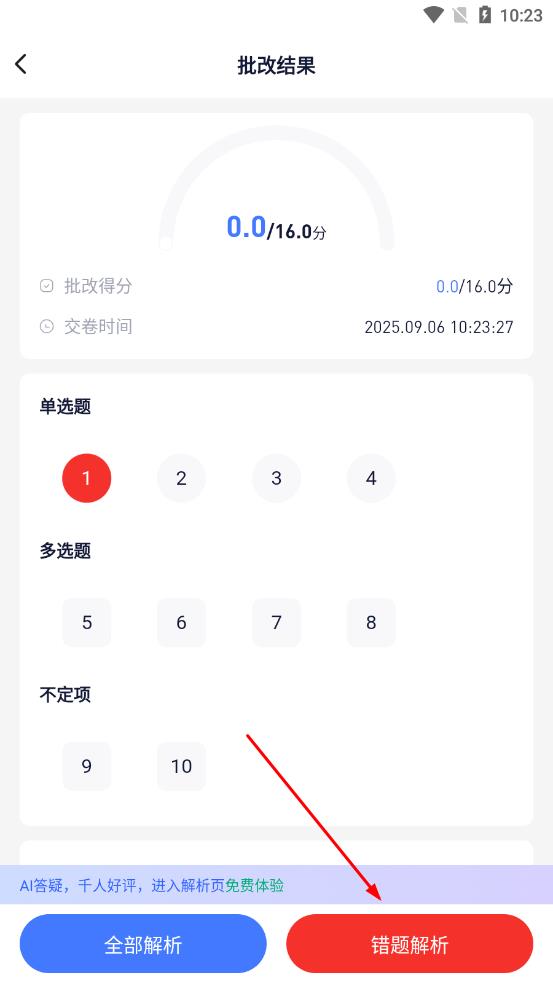4、交卷后進(jìn)入批改結(jié)果頁(yè)面,點(diǎn)擊錯(cuò)題解析按鈕。