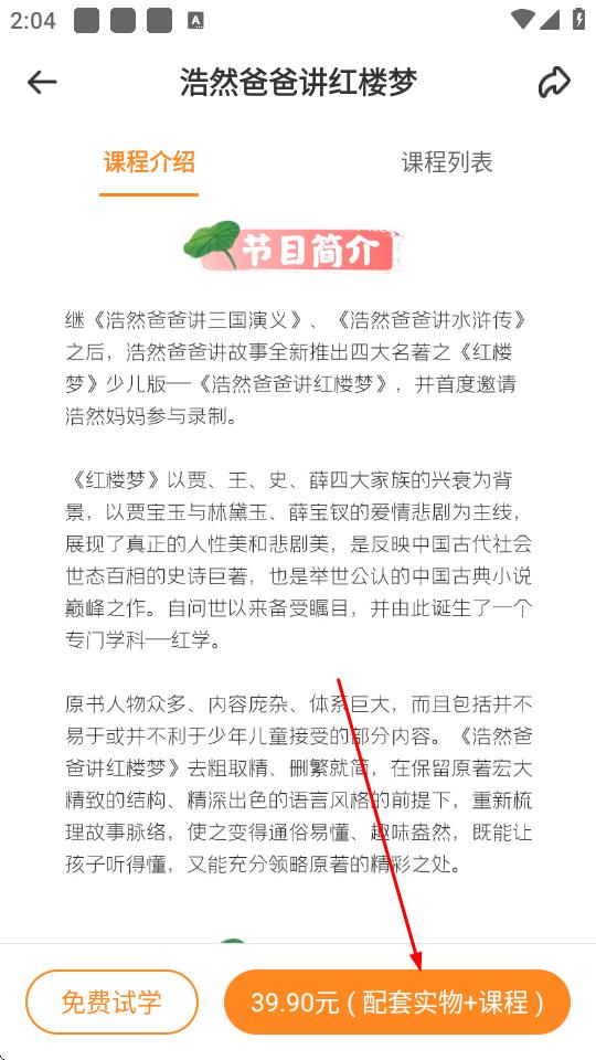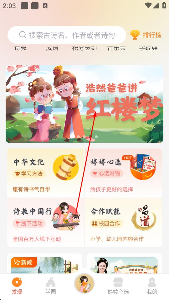 1、打開婷婷詩教APP,在首頁找到浩然爸爸講紅樓夢課程板塊,點擊進入課程頁面。