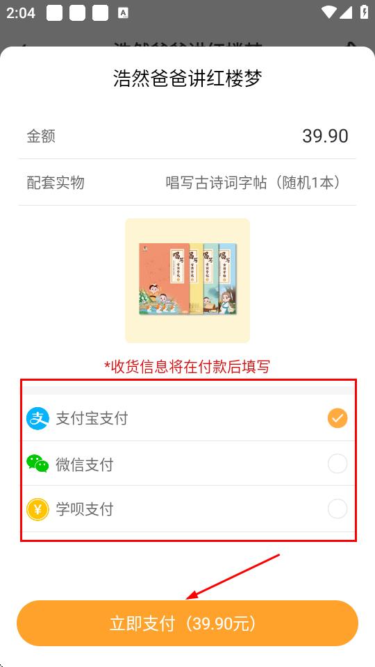 4、試聽滿意或者直接購買課程,點擊39.90元(配套實物+課程)按鈕,進入支付確認界面。