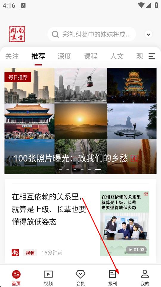 1、打開南方周末App,點擊底部導航欄中的報刊選項。