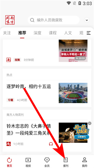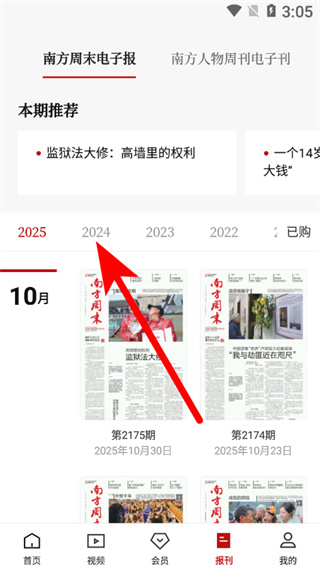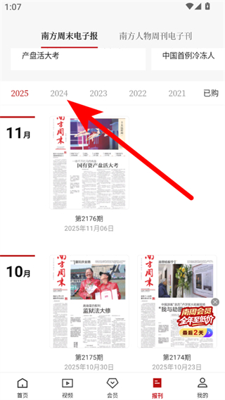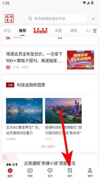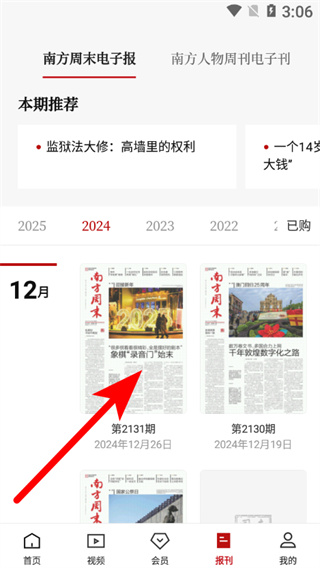 1、在南方周末首頁,點擊下方報刊選項,進入報刊頁面。