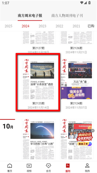 2、在“報刊”頁面,默認顯示南方周末電子報,選擇想閱讀的報紙期數(shù),點擊進入。