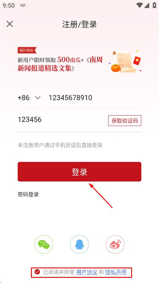 4、勾選“已閱讀并同意用戶協(xié)議和隱私聲明”,點擊“登錄”按鈕完成登錄。