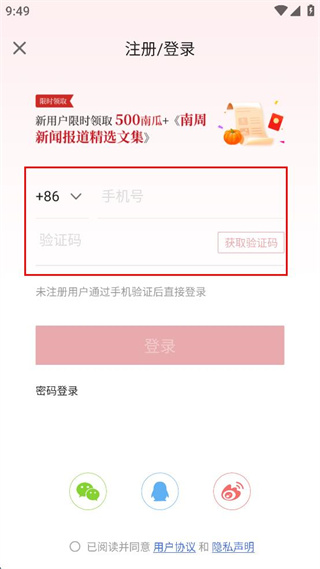 3、在注冊/登錄界面,輸入手機號,獲取并填寫驗證碼。