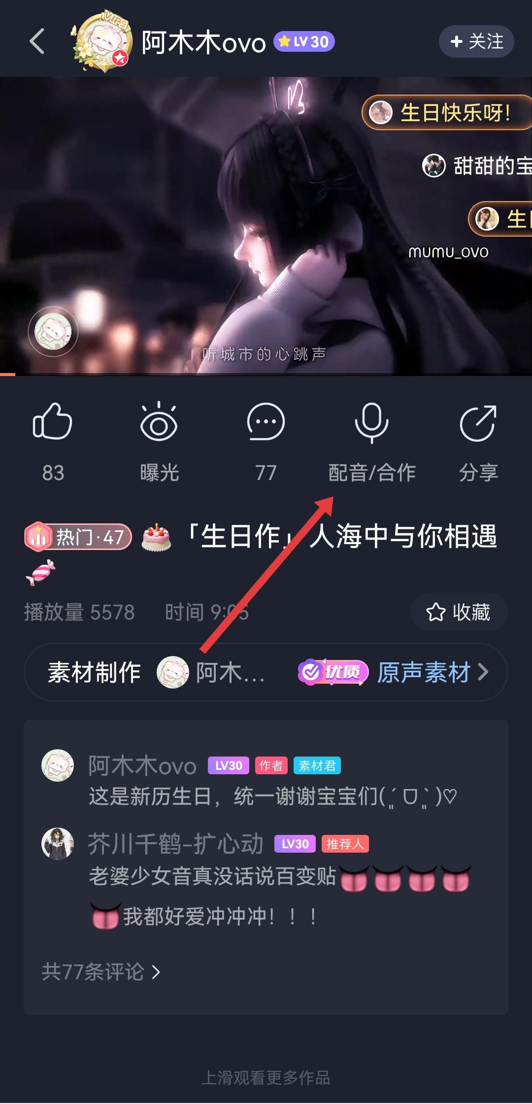 2、在作品詳情頁(yè)面,找到并點(diǎn)擊配音/合作的按鈕,進(jìn)入合作配音選項(xiàng)界面。