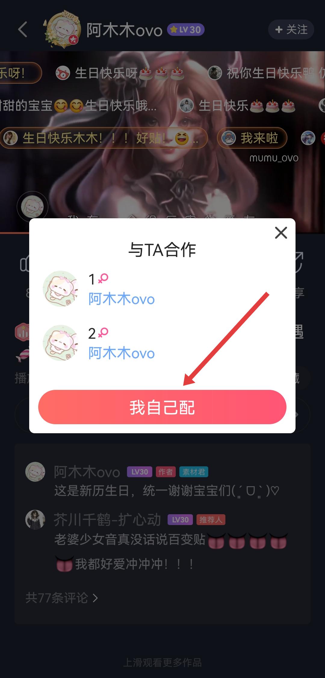 3、在彈出的與TA合作窗口中,點(diǎn)擊我自己配的按鈕,進(jìn)入配音角色選擇界面。