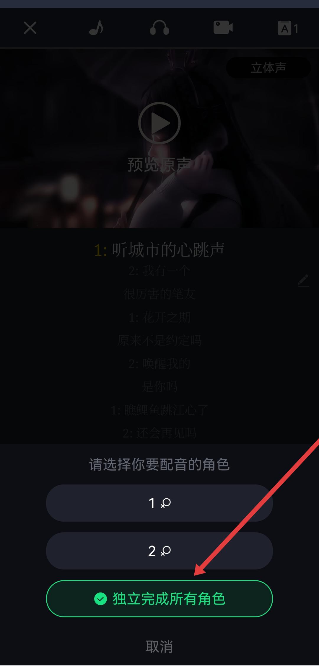 4、在配音角色選擇界面,點(diǎn)擊獨(dú)立完成所有角色按鈕,即可開(kāi)始對(duì)該作品進(jìn)行配音。