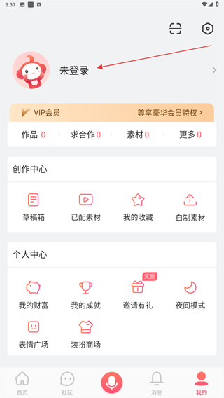 2、進(jìn)入個(gè)人主頁(yè)內(nèi),點(diǎn)擊上方未登錄的區(qū)域。