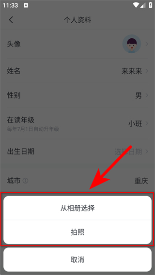 4、在彈出的選項中,選擇從相冊選擇或拍照,完成頭像圖片更換操作。