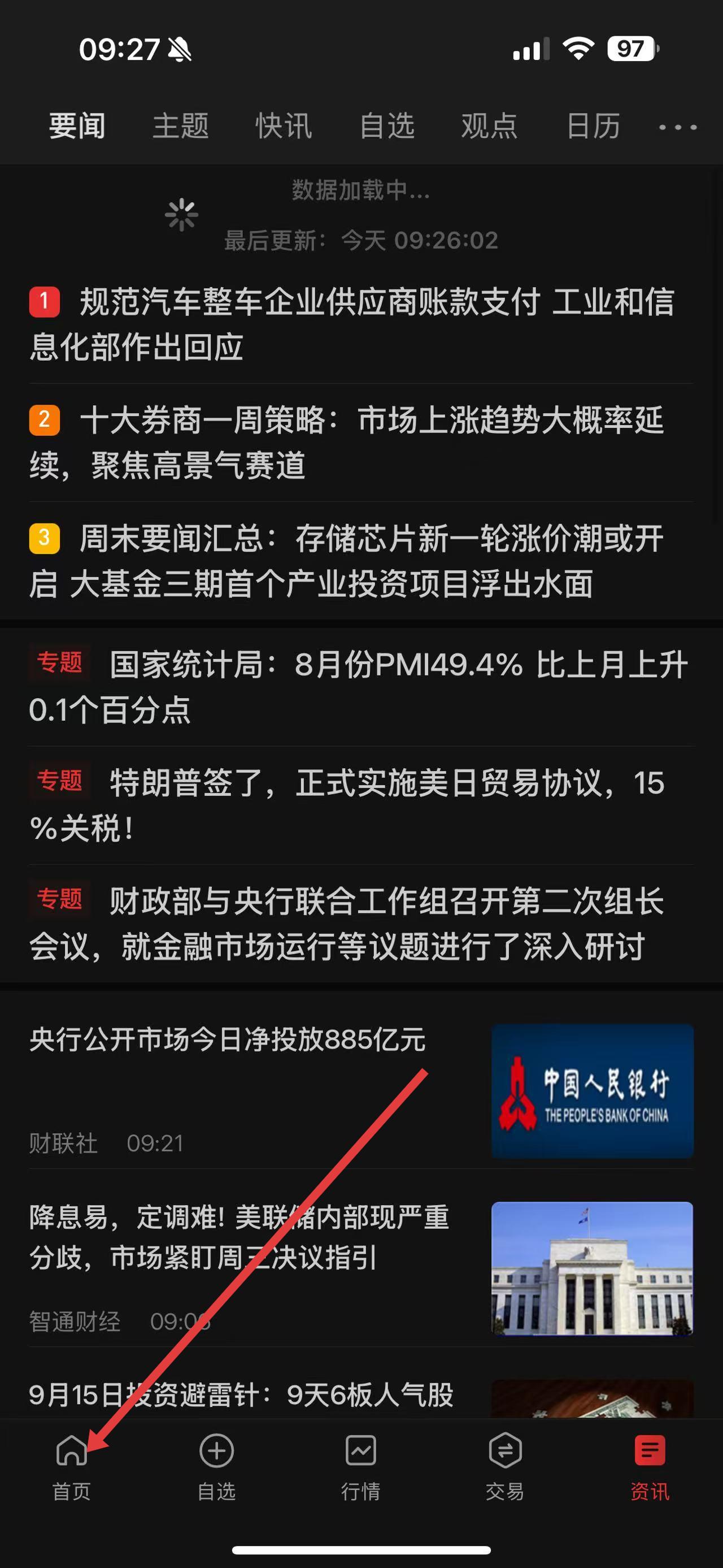 1、打開通達信應用,點擊底部導航欄中的首頁按鈕,進入首頁界面。