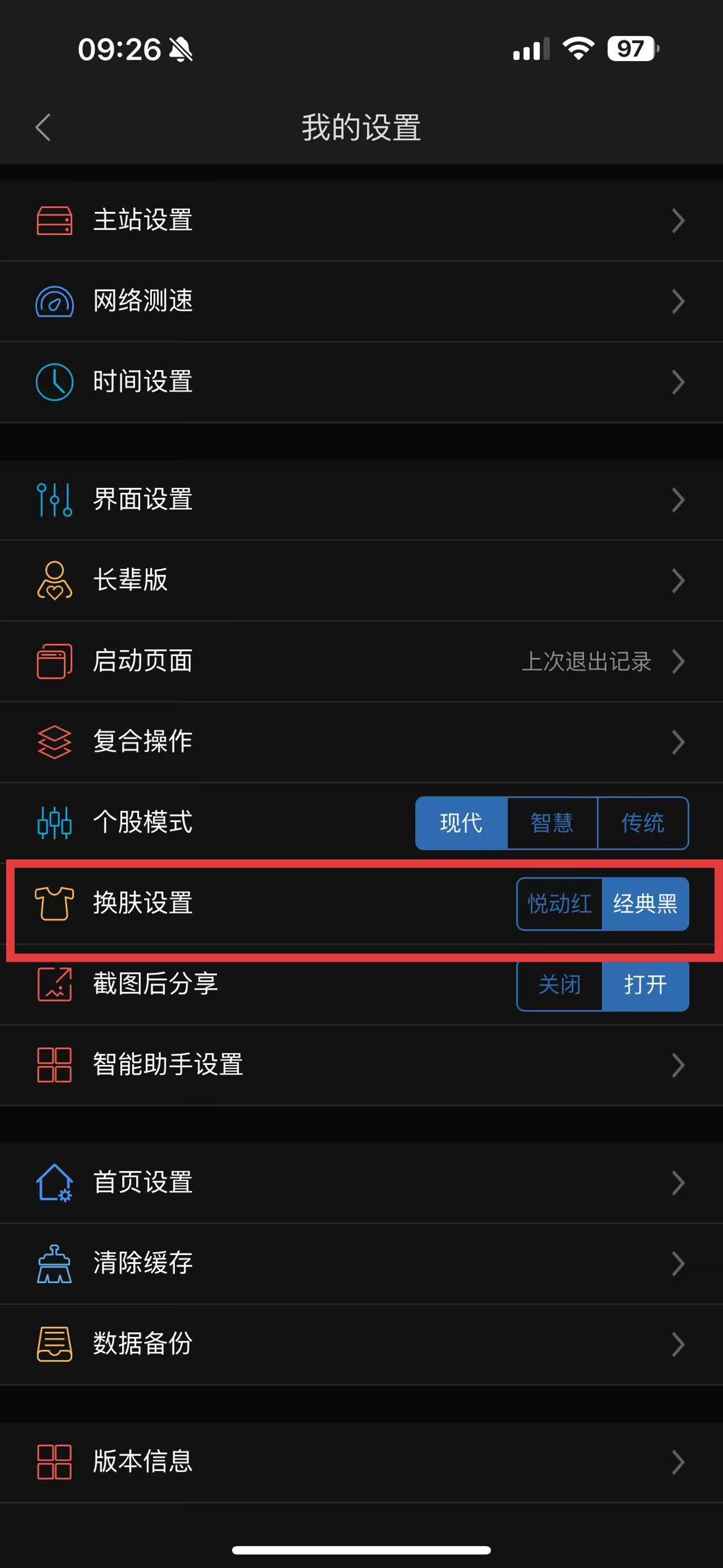 4、在我的設(shè)置頁面中,找到換膚設(shè)置選項,點擊選擇自己喜歡的皮膚,如悅動紅或經(jīng)典黑。