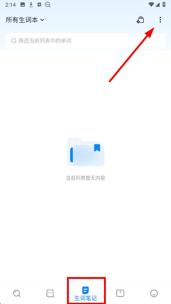 1、打開歐路詞典app點擊底部中的生詞筆記選項,在生詞本界面中點擊右上角的三點圖標。