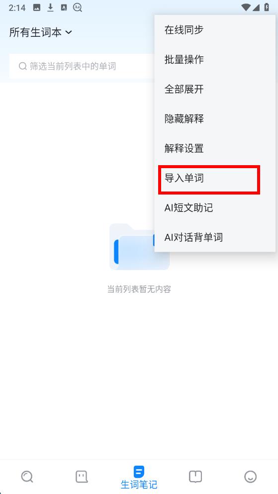2、點擊后在彈出的操作菜單里找到并點擊導入單詞的選項。